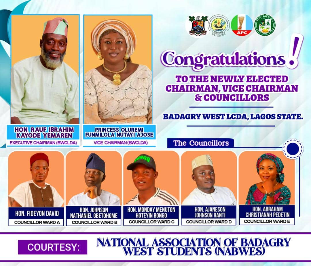 The National Association of Badagry West Students' (NABWES) was established in 2006/2007 by a group of students hailing from the Badagry West region, who were pursuing higher education in various tertiary institutions across the nation. They recognized the need for a home-based student union to create a bridge between home and their academic pursuits, particularly to reach out to the younger generation at the grassroots level.